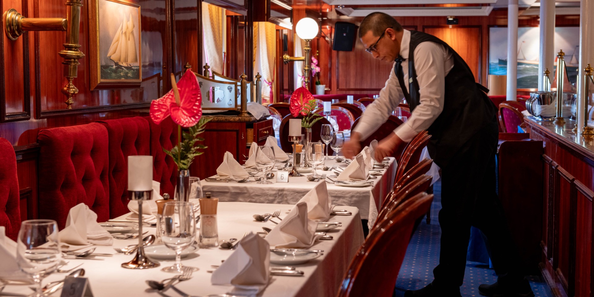 Al mattino vine servita una COLAZIONE CONTINENTALE a buffet dolce, salata e con frutta fresca; a PRANZO il ricco BUFFET proporrà, tra le generose vivande, gustose grigliate e piatti a base di pesce ; la CENA l'elegante sala da pranzo fa da sfondo ad un menù in grado di appagare la vista ed il gusto, servito in modo impeccabile e cortese, accompagnato da una raffinata selezione di vini. Gli ospiti sono liberi di pranzare e cenare all'ora che preferiscono durante gli orari di apertura del ristorante. A bordo non è richiesto l'abito di GALA, ma un abbigliamento casual e solitamente appriopriato sia per il giorno che per la sera.