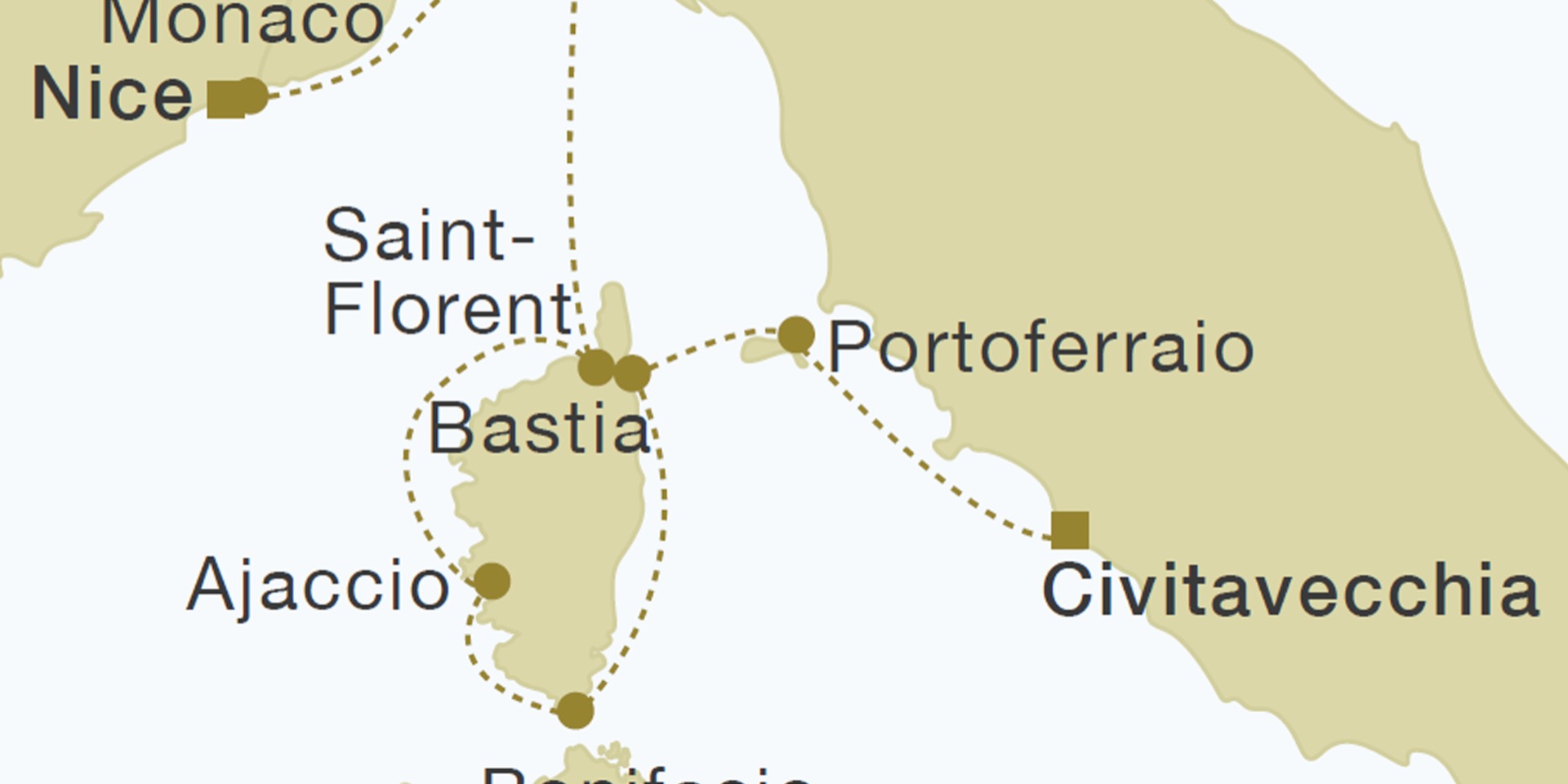 IMBARCO a NIZZA (Francia) - RADA PRINCIPATO di MONACO (con possibilità di sbarco) - RADA di PORTOFINO (con possibilità di sbarco) - SAINT FLORENT (Corsica) con Visita Guidata e 4x4 a per raggiungere la spiaggia di Salaccia - AJACCIO (Corsica) con Visite effettuato con un tipico trenino - BONIFACIO (Corsica) con Visite effettuate con un tipico trenino e pranzo in ristorante tipico - BASTIA (Corsica) con Visita Guidata - PORTOFERRAIO (sbarco libero) - CIVITAVECCHIA con sbarco Crociera.