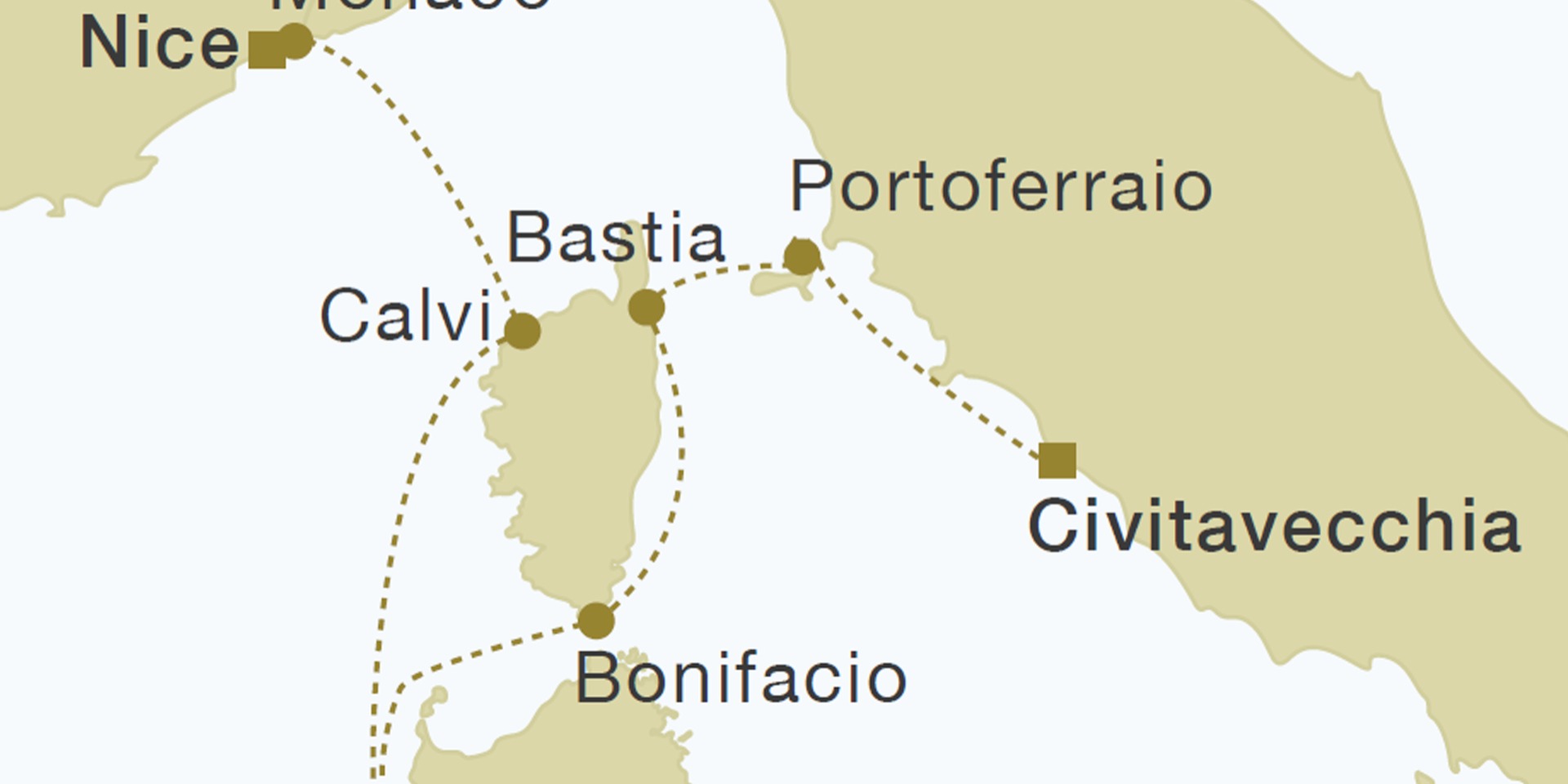 IMBARCO a NIZZA (Francia) - RADA PRINCIPATO di MONACO (con possibilità di sbarco) - CALVI (Corsica) con Visita Guidata e degustazioni vini - ILE ROUSSE (Corsica) con Visite Guidate - ALGHERO (con possibilità di sbarco) - BONIFACIO (Corsica) con Visite effettuate con un tipico trenino e pranzo in ristorante tipico - BASTIA (Corsica) con Visita Guidata - PORTOFERRAIO (sbarco libero) - CIVITAVECCHIA con sbarco Crociera.